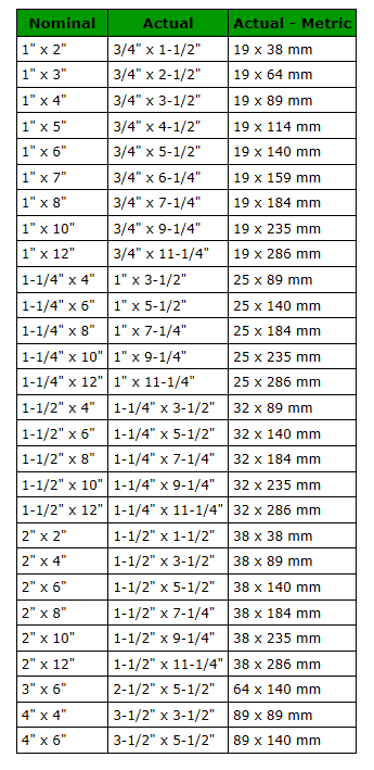 Here are the common sizes of lumber and their actual sizes.